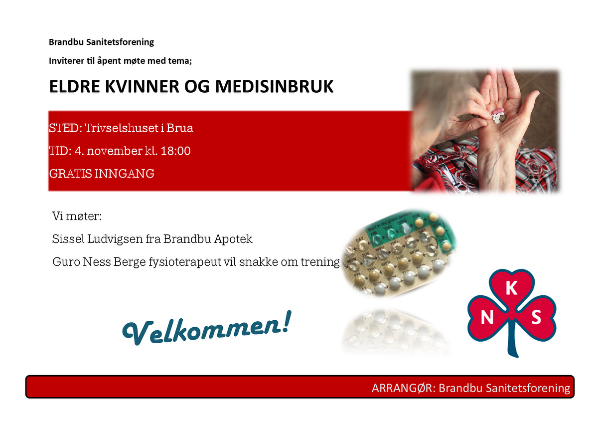 Eldre kvinner og medisinbruk. Brandbu Sanitetsforeninger inviterer til åpent møte på Trivselshuset i Brua!